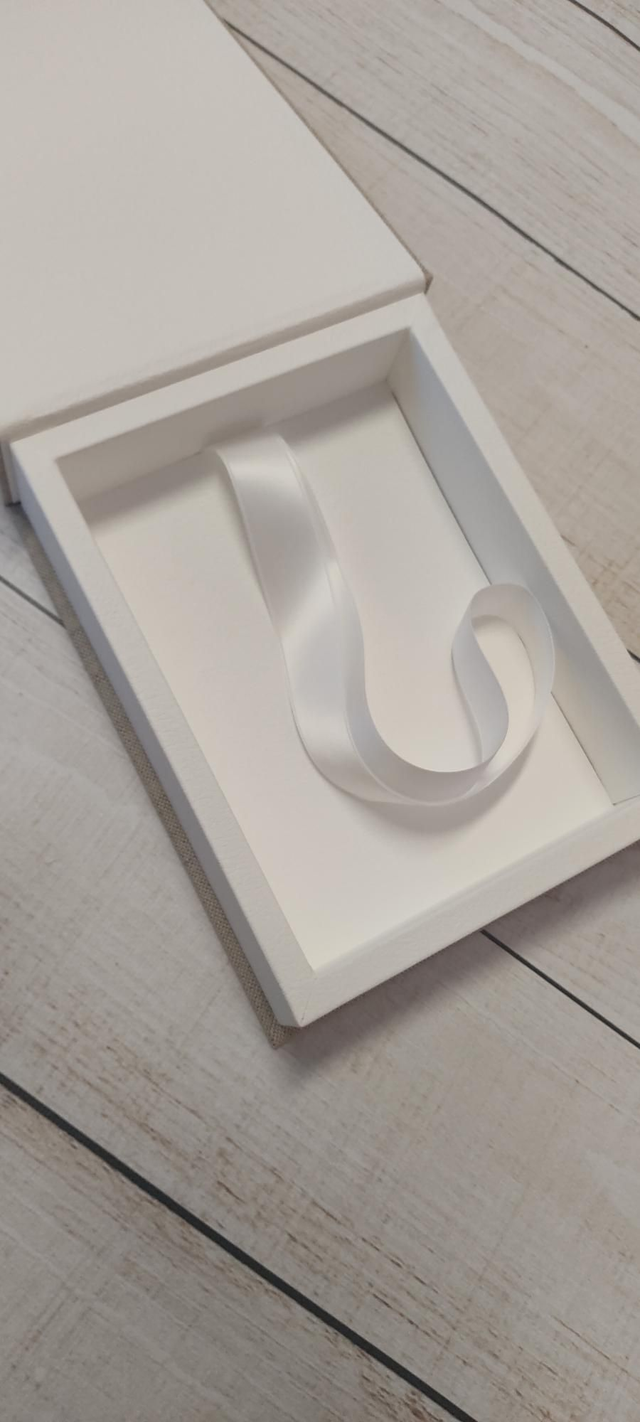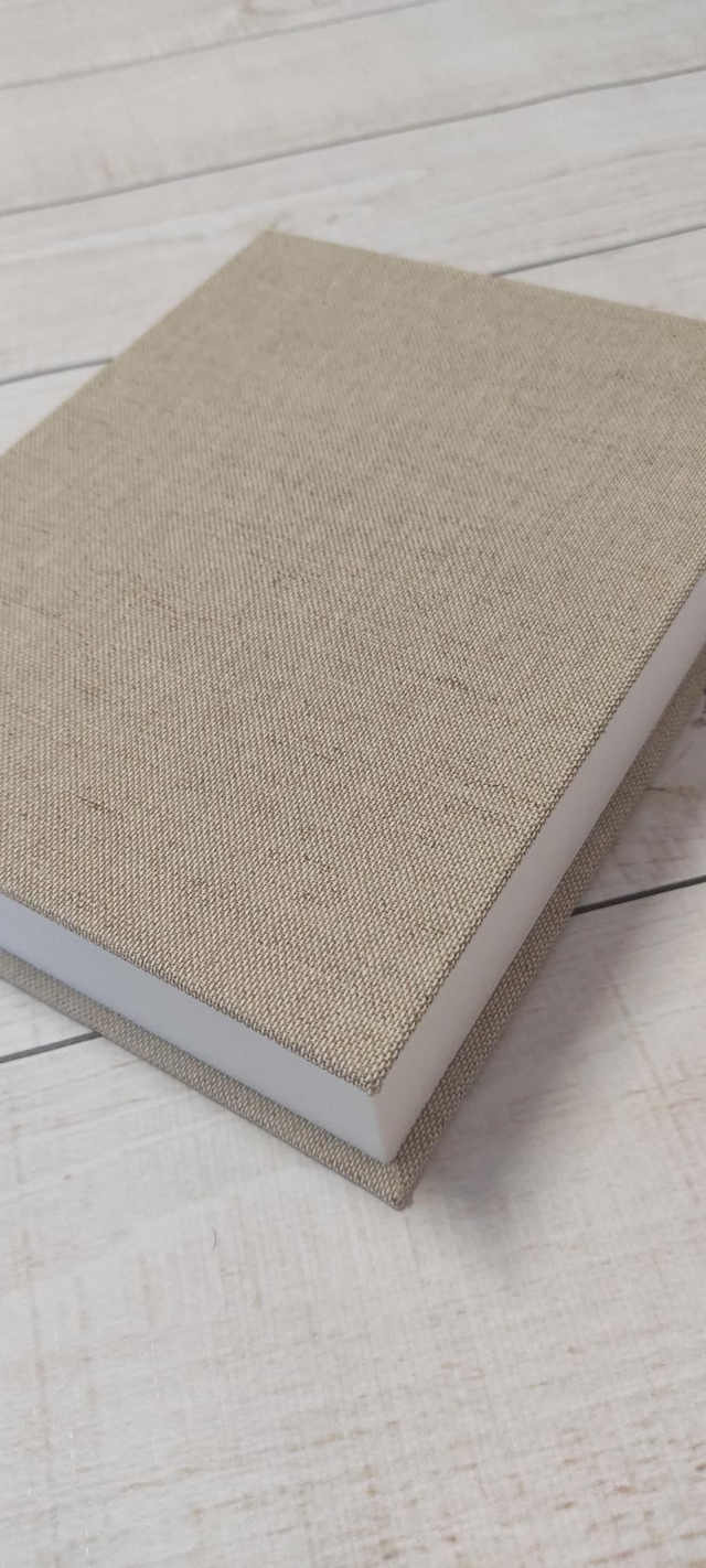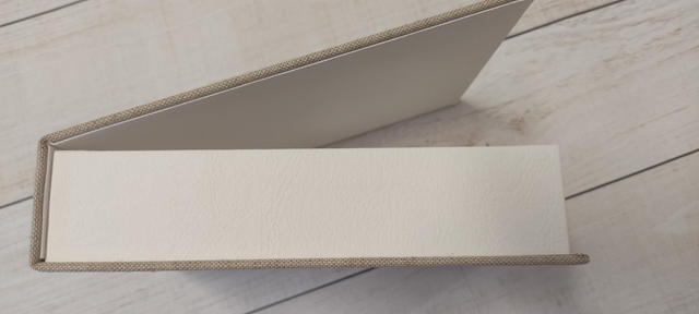Fotobox, handgefertigt für eine Druckgröße der Bilder von 13x18 cm. Der Haupt-Korpus ist mit weißem Kunst-Leder überzogen, die "Außenhaut" ist mit einem Leinenstoff veredelt.